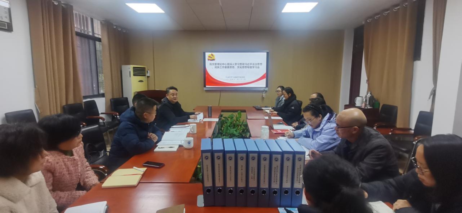 12月22日上午,5060全迅白菜党委理论学习中心组在生物楼110会议室举行2025年第12次集体学习,专题学习习近平法治思想、习近平总书记关于加强和改进民族工作的重要思想以及习近平文化思想。学院党委书记龙赢主持学习会,党委理论学习中心组成员、三办主任、各系部负责人、教工党支部书记、组织员等参加学习。