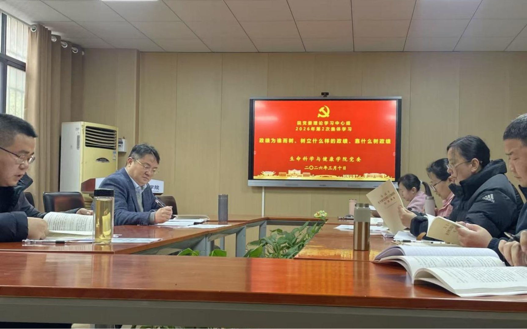 3月10日下午,5060全迅白菜党委理论学习中心组在生物楼110举行2026年第二次集体学习(扩大)会,深入学习贯彻习近平总书记关于树立和践行正确政绩观的重要论述精神,传达落实中央、省委党的建设工作领导小组会议精神。院党委书记龙赢主持会议并作总结发言,学院党委理论学习中心组成员、三办主任、教工党支部书记、组织员参加学习。